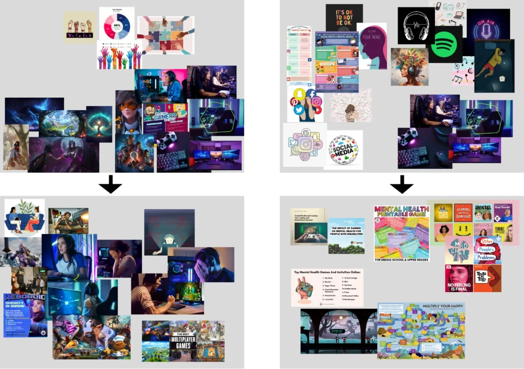 In het vormgeven van mijn eigen project ben ik onderzoek gaan doen naar verschillende onderwerpen, waaronder mentale gezondheid bij jongeren (zie researchwall links). Uiteindelijk besloot ik wat dichter bij mijn interesses te liggen en heb ik besloten mij te richten op jongvolwassen gamers.