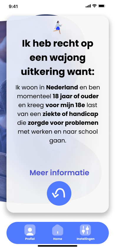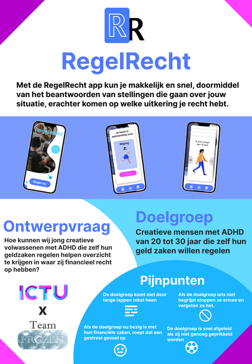 In dit project kregen mijn team en ik de opdracht van ICTU (ICT-Uitvoeringsorganisatie), de opdracht om kwetsbare burgers te helpen inzicht te krijgen in waar zij financieel recht op hebben. Wij als team kozen toen ons te verdiepen in de doelgroep: ”Creatieve ADHD’ers van 18 tot 30 jaar oud die bezig zijn met hun financiële zaken”. We wilden een digitaal product ontwerpen waar onze doelgroep via een interactie met ons product weet waar zij financieel recht op hebben met betrekking tot toeslagen en uitkeringen.